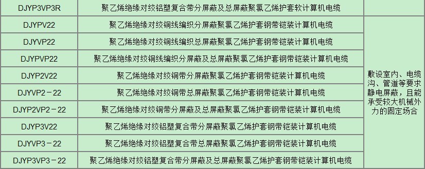 本產(chǎn)品適用于額定電壓500V及以下對(duì)于防干擾性要求較高的電子計(jì)算機(jī)和自動(dòng)化連接用電纜。